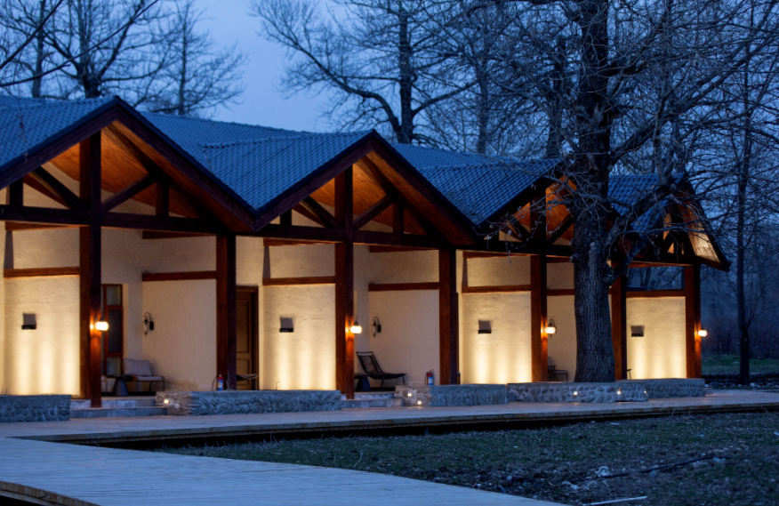 Linyin (it means “hidden in the forest” in Chinese) hotel is located in the forest, covering an area of 80mu (around 53,333 square meters). It is built with wood, stones, and glass, attempting to build a sightseeing place in the natural landscape. There are 55 guest rooms in the hotel (first phase), including 32 standard rooms, 10 queen-size rooms, 2 family suites, and 11 courtyard suites, supported by an restaurant covering 300m2. The guest rooms feature large space with scenic view, equipped with high-grade exquisite furniture and sanitary wares in compliance with quasi-five-star standards of ecological garden hotel. The decoration emphasizes the uniform and individualized style for comfort, warmth and practicality.
